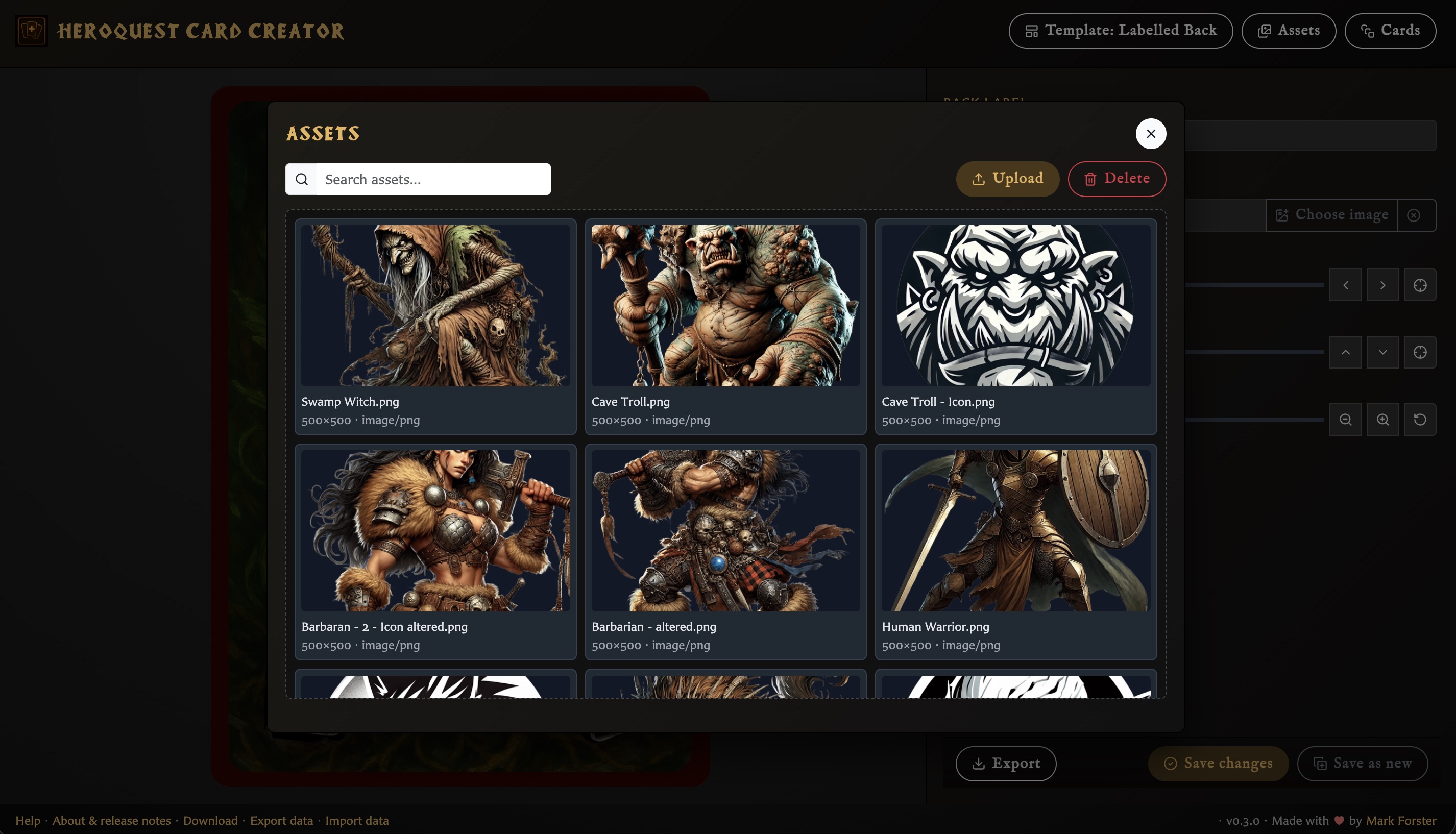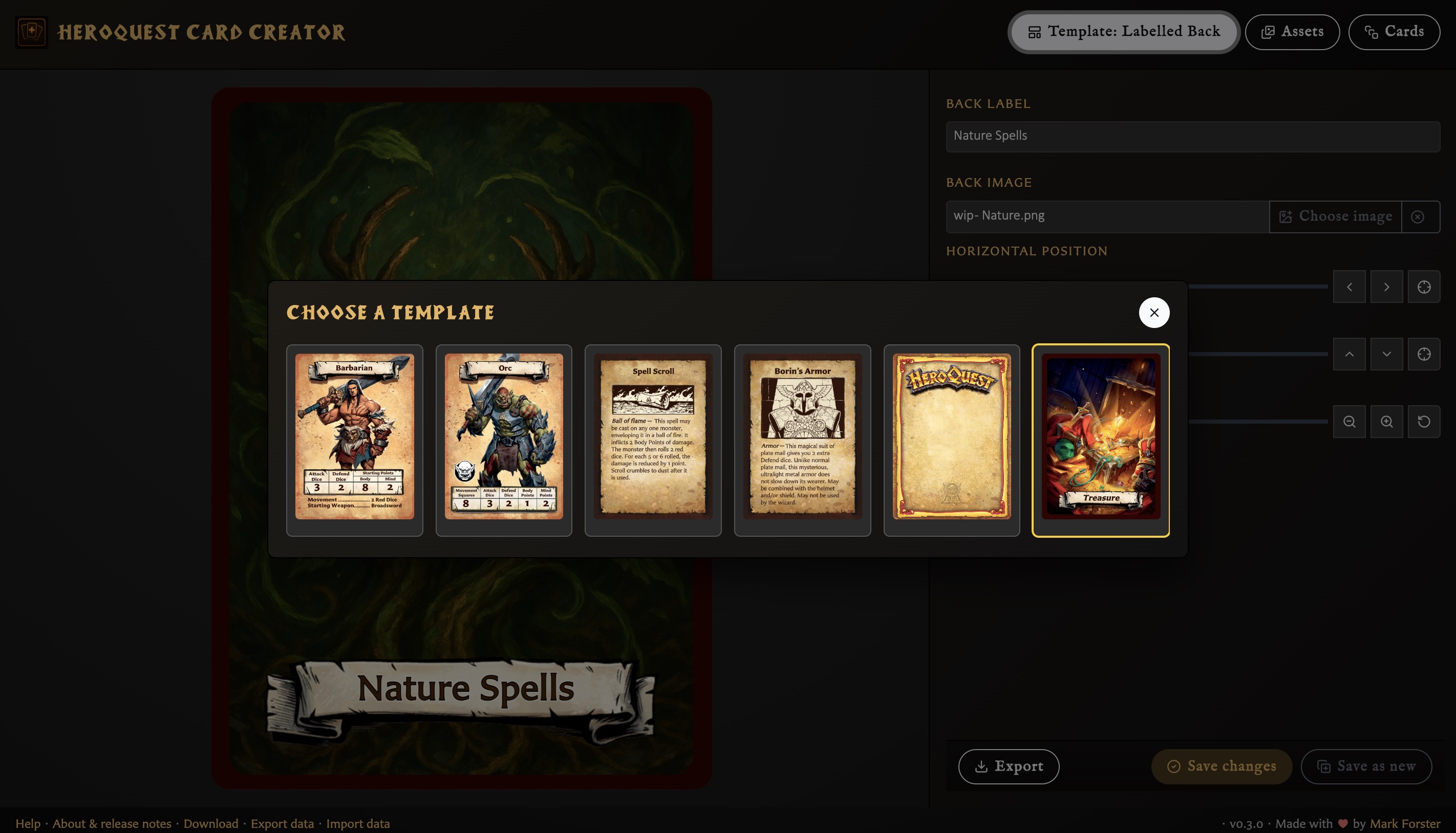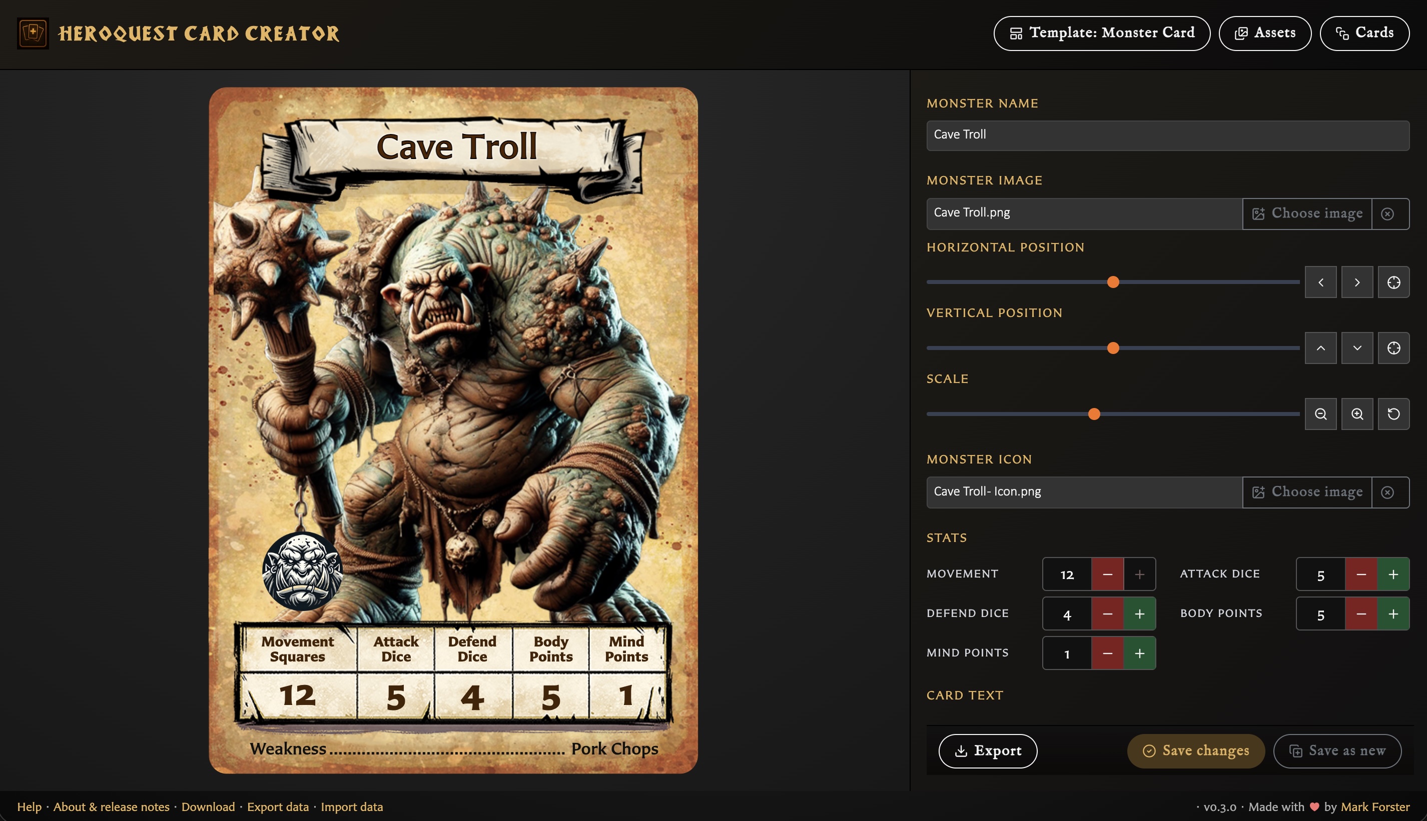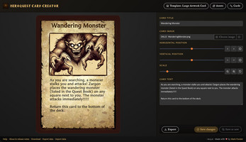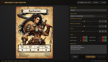 You work entirely in a friendly editor: pick a template (hero, monster, treasure, backs, and more), drop in artwork from a built‑in asset library, tweak framing with simple sliders, and type your rules text with support for bold, italic, and neat dotted “leader lines” for things like costs. Stats are edited using compact controls that mirror the strip on the card, so what you see on the right matches what appears on the card preview to the left. When you’re happy, you can save named cards into a stockpile, revisit and update them later, and export finished cards as high‑quality PNGs ready for print or layout.
