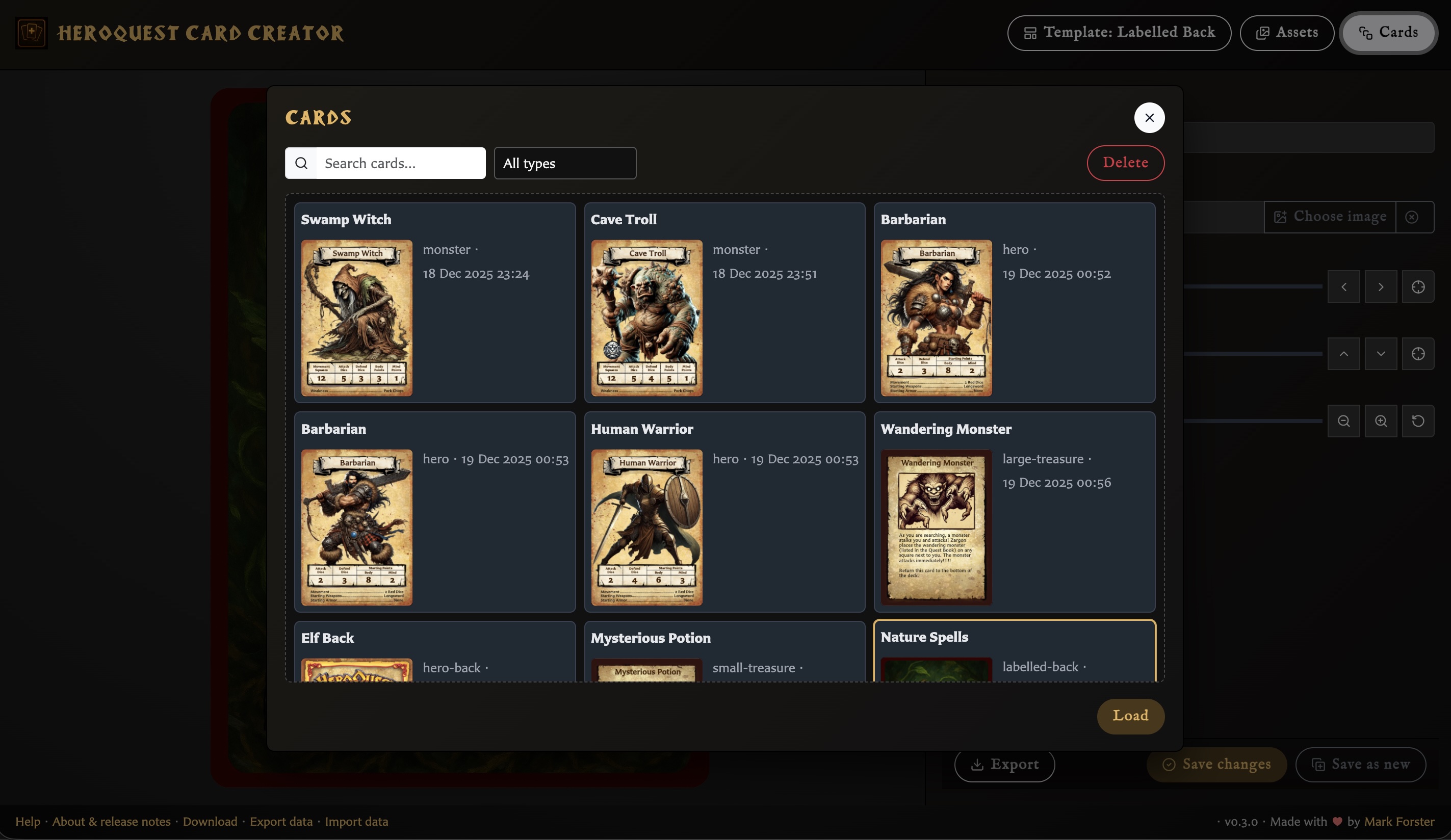 HeroQuest Card Creator is a browser‑based tool for designing custom HeroQuest‑style cards that look and feel like they came straight out of the original box. If you’ve ever tried to hack together cards in a generic graphics editor, fought with fonts, spacing, and alignment, or lost work between sessions, this is meant to fix all of that. The layouts, typography, and proportions are tuned to match the classic cards, so you can focus on ideas—heroes, monsters, treasure—rather than fiddling with templates.